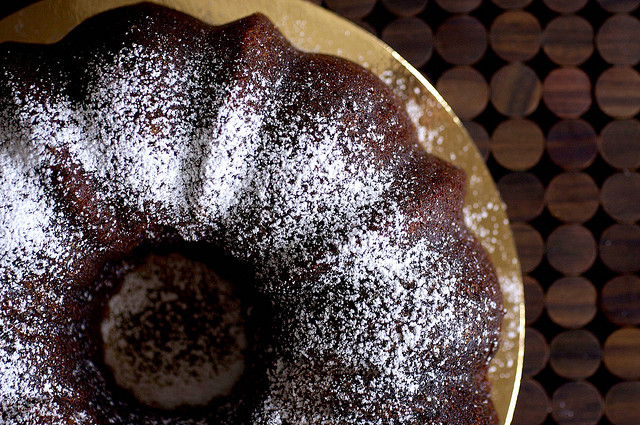 This is dark and sticky and chewy and heavy and spicy and a zillion other adjectives that end in y that are so overused, they border on hackneyed, but you know what? It is not this cake’s fault. It can’t help being awesome, and fragrant (our living room smells like Christmas), attention-grabbing (nobody puts it in the corner) and totally respecting of your busy schedule (because it tastes even better on days two and three than it did out of the oven).
